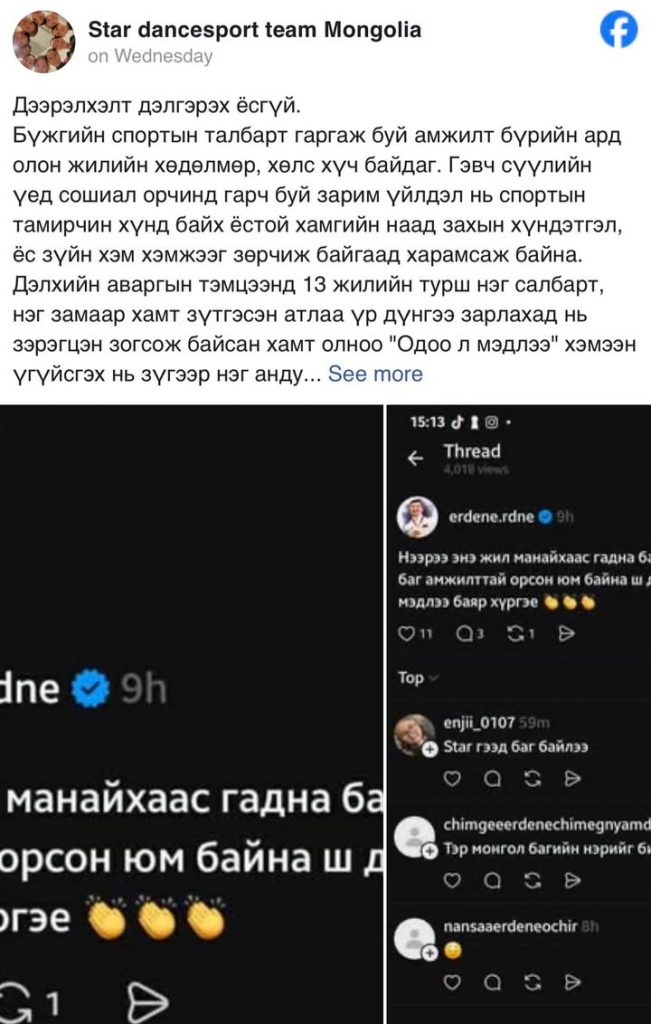 “Дээрэлхэлт дэлгэрэх ёсгүй. Бүжгийн спортын талбарт гаргаж буй амжилт бүрийн ард олон жилийн хөдөлмөр, хөлс хүч байдаг. Гэвч сүүлийн үед сошиал орчинд гарч буй зарим үйлдэл нь спортын тамирчин хүнд байх ёстой хамгийн наад захын хүндэтгэл, ёс зүйн хэм хэмжээг зөрчиж байгаад харамсаж байна.