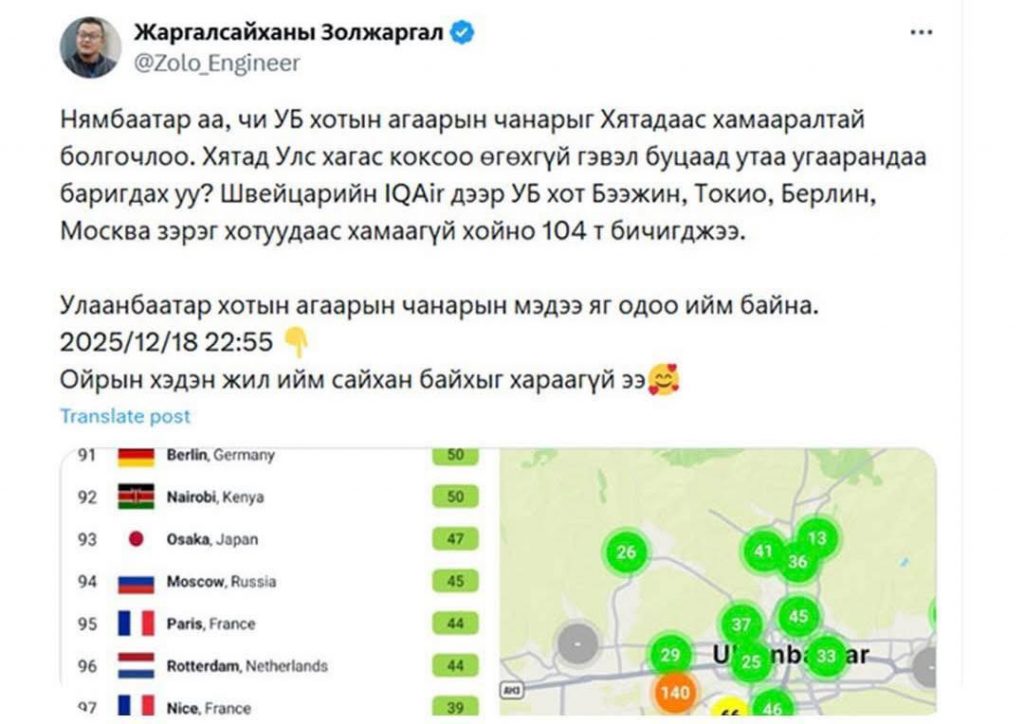 Тэрээр, “Нямбаатар аа, чи УБ хотын агаарын чанарыг Хятадаас хамааралтай болгочлоо. Хятад Улс хагас коксоо өгөхгүй гэвэл буцаад утаа угаарандаа баригдах уу? Швейцарын IQAir дээр УБ хот Бээжин, Токио, Берлин, Москва зэрэг хотуудаас хамаагүй хойно 104-т бичигджээ. Улаанбаатар хотын агаарын чанарын мэдээ яг одоо ийм байна. 2025/12/18 22:55
