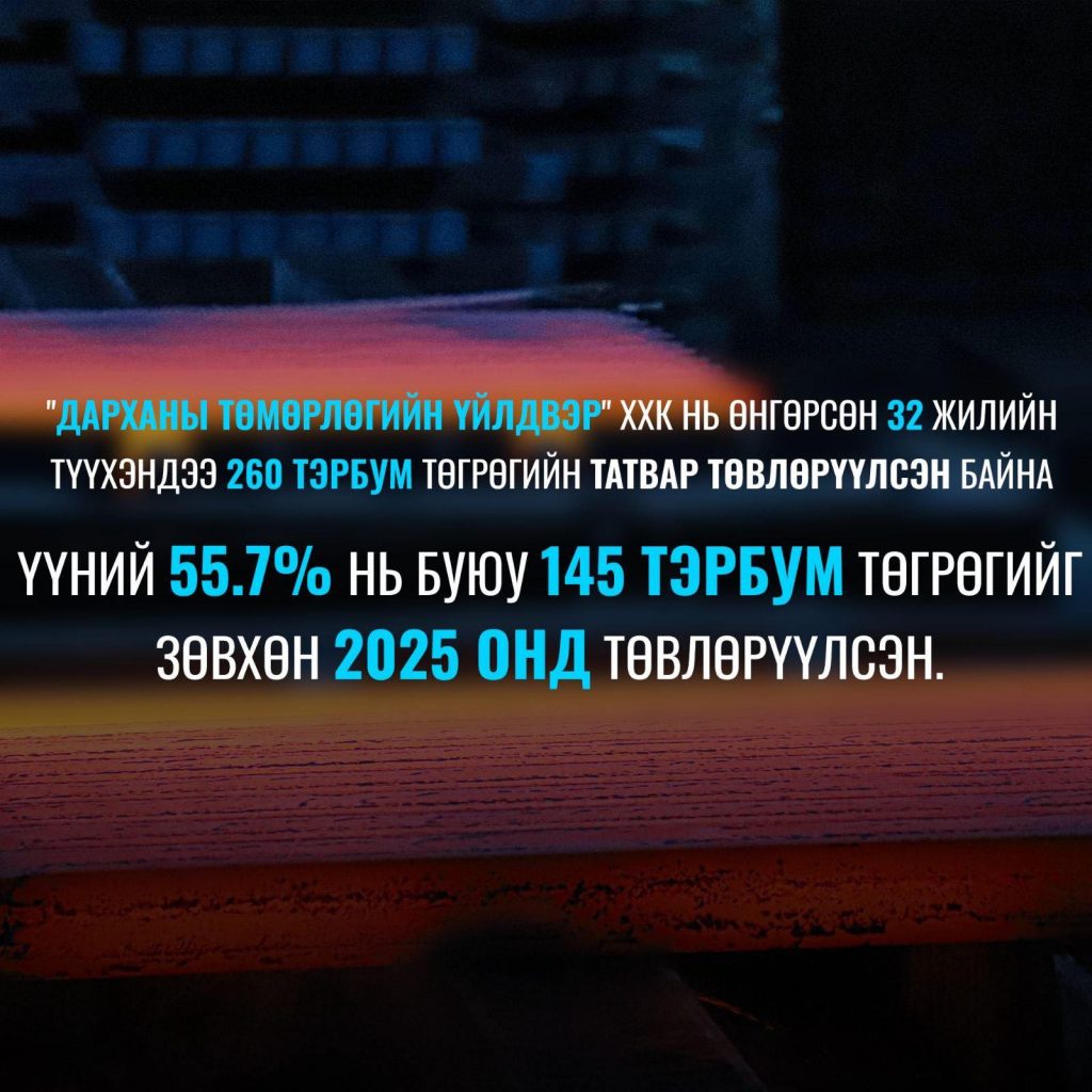 “Дарханы төмөрлөгийн үйлдвэр” ХХК 32 жилийн хугацаанд улсын төсөвт нийт 267.8 тэрбум төгрөг төвлөрүүлсэн бол зөвхөн сүүлийн 1.5 жилийн хугацаанд 144.8 тэрбум төгрөг, буюу нийт дүнгийн 54 хувийг бүрдүүлэн ажиллажээ