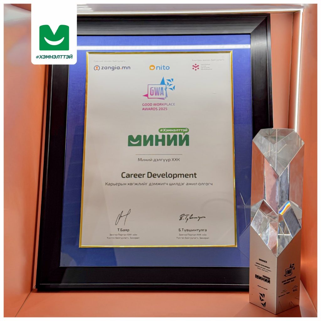 “МИНИЙ ДЭЛГҮҮР” ХХК нь Монгол Улсын хэмжээнд ажил олгогч байгууллагуудын ажлын орчин, хүний нөөцийн бодлого, ажилтны хөгжлийг дэмжих шилдэг туршлагыг тодруулах зорилготой “Good Workplace Awards 2025” үндэсний арга хэмжээнд 4 дэх жилдээ амжилттай оролцож, “Career Development” буюу Карьерын хөгжлийг дэмжигч шилдэг ажил олгогч шагналыг хүртлээ.