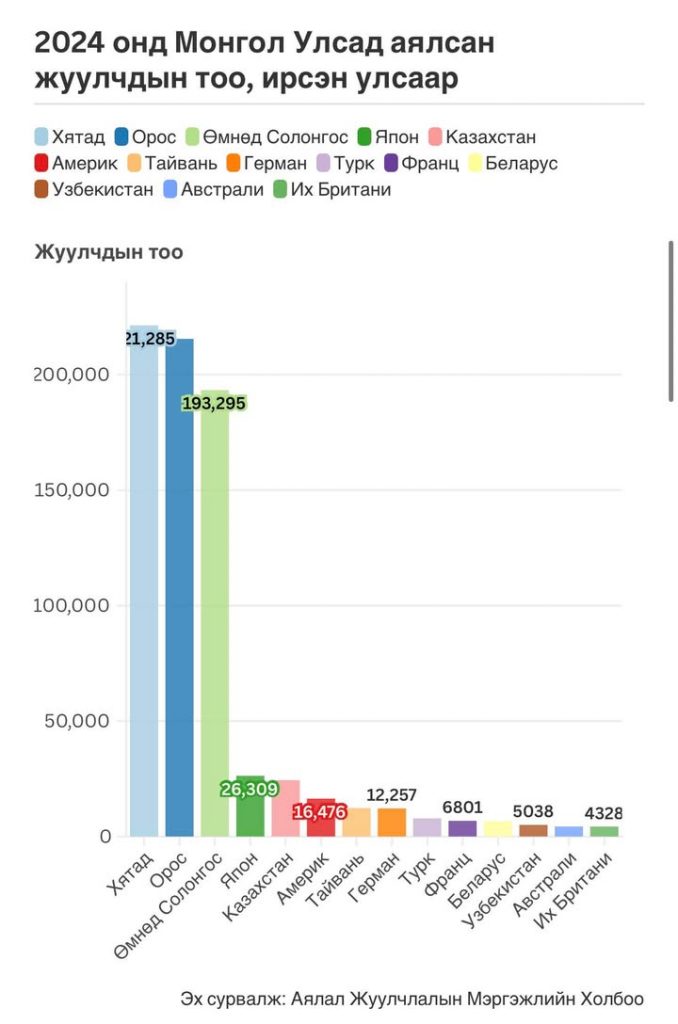2024 онд манай улсад гадаадаас 808,956 жуулчин ирж, аялсан. Үүний бараг 1/4 нь БНСУ-ын жуулчид юм.