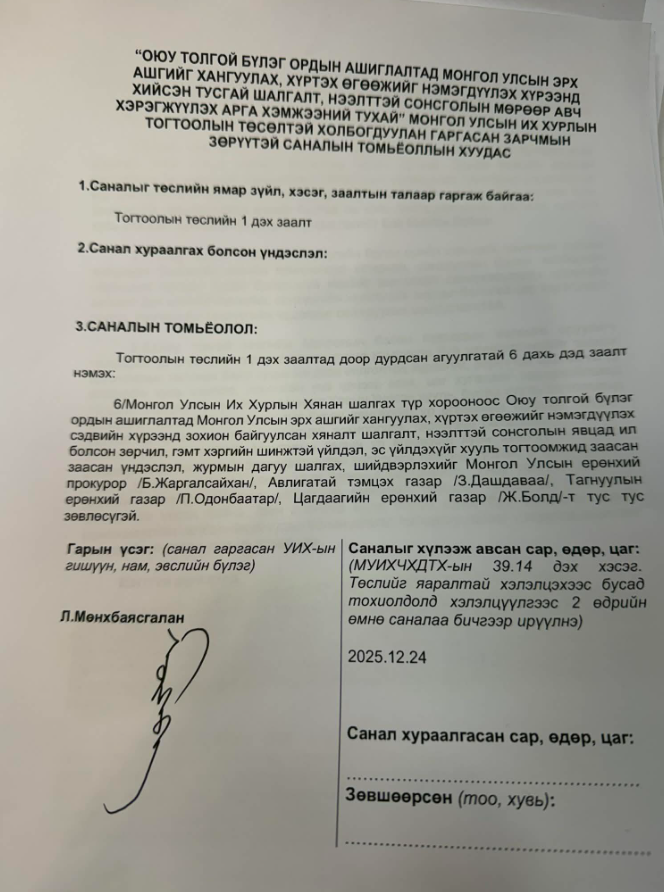 Миний гаргасан зарчмын зөрүүтэй саналд “Монгол Улсын Их Хурлын Хянан шалгах түр хорооноос Оюутолгой бүлэг ордын ашиглалтад Монгол Улсын эрх ашгийг хангуулах ,хүртэх өгөөжийг нэмэгдүүлэх сэдвийн хүрээнд байгуулсан хяналт шалгалт , нээлттэй сонсголын явцад ил болсон зөрчил , гэмт хэргийн шинжтэй үйлдэл, эс үйлдэхүйг хууль тогтоомжид заасан үндэслэл, журмын дагуу шалгах, шийдвэрлэхийг Монгол Улсын ерөнхий проокурор /Б.Жаргалсайхан/ , Авилгатай тэмцэх газрын дарга /З.Дашдаваа/, Тагнуулын ерөнхий газрын дарга /П.Одонбаатар /, Цагдаагийн Ерөнхий газрын дарга /Ж.Болд / нарт тус тус зөвлөсүгэй.