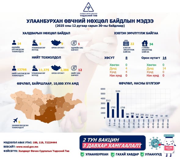 байгууллагад эмчилгээ авч байна. Тэдний биеийн байдал дунд дөрөв, хүнд дөрөв байгаа талаар ХӨСҮТ-өөс мэдээллээ.Мөн нас баралт шинээр нэг бүртгэгдэж, 12 болжээ. Улаанбурхан өвчин нь