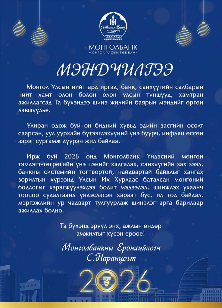 Нийгэм С.Наранцогт: Улиран одож буй он бидний хувьд сургамж дүүрэн жил байлаа mnews2 January 1, 2026 About Author mnews2 See author's posts Post Navigation Previous ХХБ АНУ-ын The Bank of New York Mellon (BNY)-оор үнэлүүлж, шагнал хүртэвNext Г.Номин: Баярын өдрүүд, аялал зугаалгын үед улаанбурханаас сэргийлцгээе! More Stories Нийгэм “Бөөрөлжүүт”-ийн ЦС-д үүссэн доголдол маргаашнаас хэвийн болно mnews2 January 24, 2026 Нийгэм С.Одонтуяа: СУИС-ийн долоон залууд хүчирхийлүүлсэн гэх эмэгтэйн асуудлыг зүгээр сонсоод өнгөрч болохгүй mnews2 January 24, 2026 Нийгэм Дүнжингаравын ослын ХОХИРОГЧИД: Монголын төр иргэдээ хөсөр хаялаа, уучлалт гуй mnews2 January 24, 2026