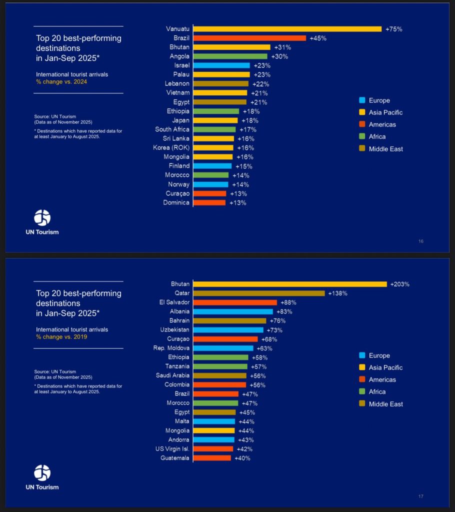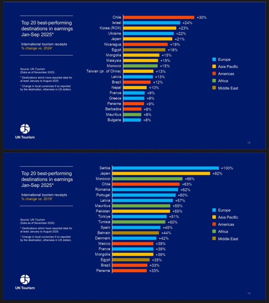 Нэгдсэн Үндэстний Байгууллагын Дэлхийн Аялал Жуулчлалын Байгууллагаас (UN Tourism) гаргасан World Tourism Barometer, 2025 оны 11 дүгээр сар тайланд Монгол Улс аялал жуулчлалын салбарын сэргэлт, өсөлтийн үзүүлэлтээрээ дэлхийн шилдэг гүйцэтгэлтэй орнуудын нэг болохыг албан ёсоор баталгаажуулсан талаар Аялал жуулчлалын мэргэжлийн холбооноос мэдээлжээ.