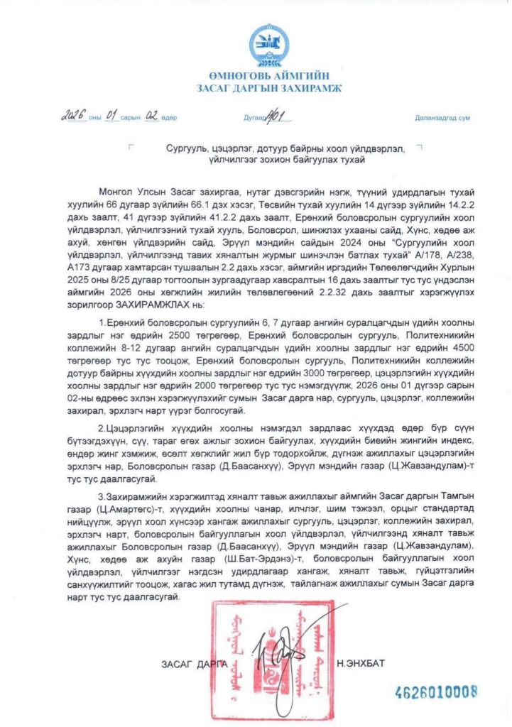 Өмнөговь аймгийн засаг дарга Н.Энхбатын 2026 оны анхны захирамжаа ХҮҮХЭД БҮРТ ҮДИЙН ХООЛ олгох ажлыг зохион байгуулах тухай байлаа.