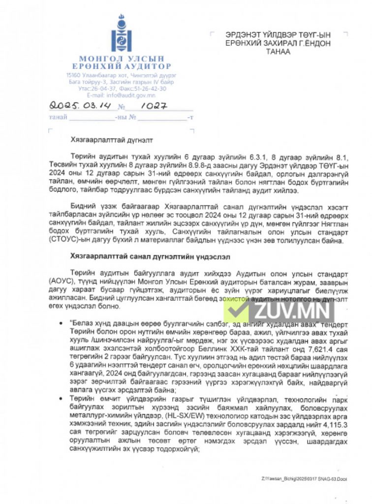 Санхүүгийн тайлангийн аудитаар 28 тэрбум 112.2 сая төгрөгийн 3 асуудалд зөрчлийг таслан зогсоох, сахилгын хариуцлага тооцуулах албан шаардлага тус тус хүргүүлжээ.