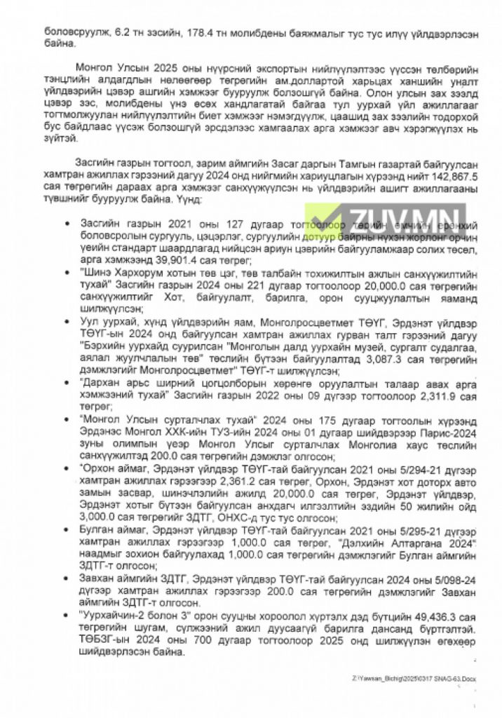 Мөн 62 тэрбум 213.2 сая төгрөгийг нийгмийн шинжтэй хөрөнгө оруулалтын ажилд зарцуулсан гэх ч дэлгэрэнгүй тайлан одоогоор алга.