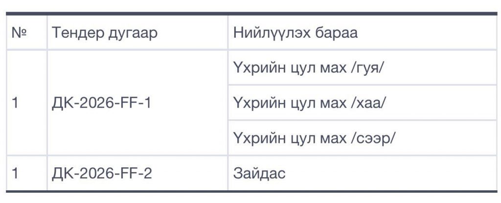 Бүртгүүлсэн аж ахуйн нэгжид тендерийн материалыг 2026 оны 01 дүгээр сарын 19-ний өдрийн 17:00 цаг хүртэл илгээнэ.