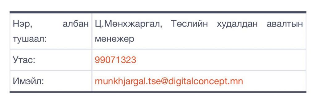 Сонирхсон этгээдүүд munkhjargal.tse@digitalconcept.mn цахим шуудангийн хаягт 2026 оны 01 дүгээр сарын 14-ний өдрийн 15:00 цагийн дотор тендерт оролцох хүсэлтээ ирүүлж бүртгүүлнэ.