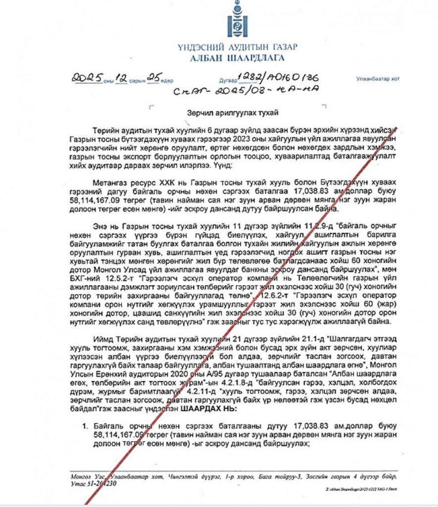 Мөн “Метан газ ресурс” ХХК нь Таван толгой XXXIII талбайн кемпийн ажлын байранд ашиглах туршилтын босоо цооногийн өрөмдлөг хийх өрмийн хошуутай байх шаардлагыг хангаагүй, нэмэлт зардал гаргаж 5.762.34 ам.долларын төсөв хэтрүүлсэн аудитын шалгалтаар ил болжээ.