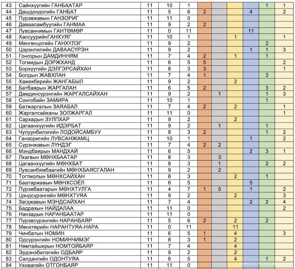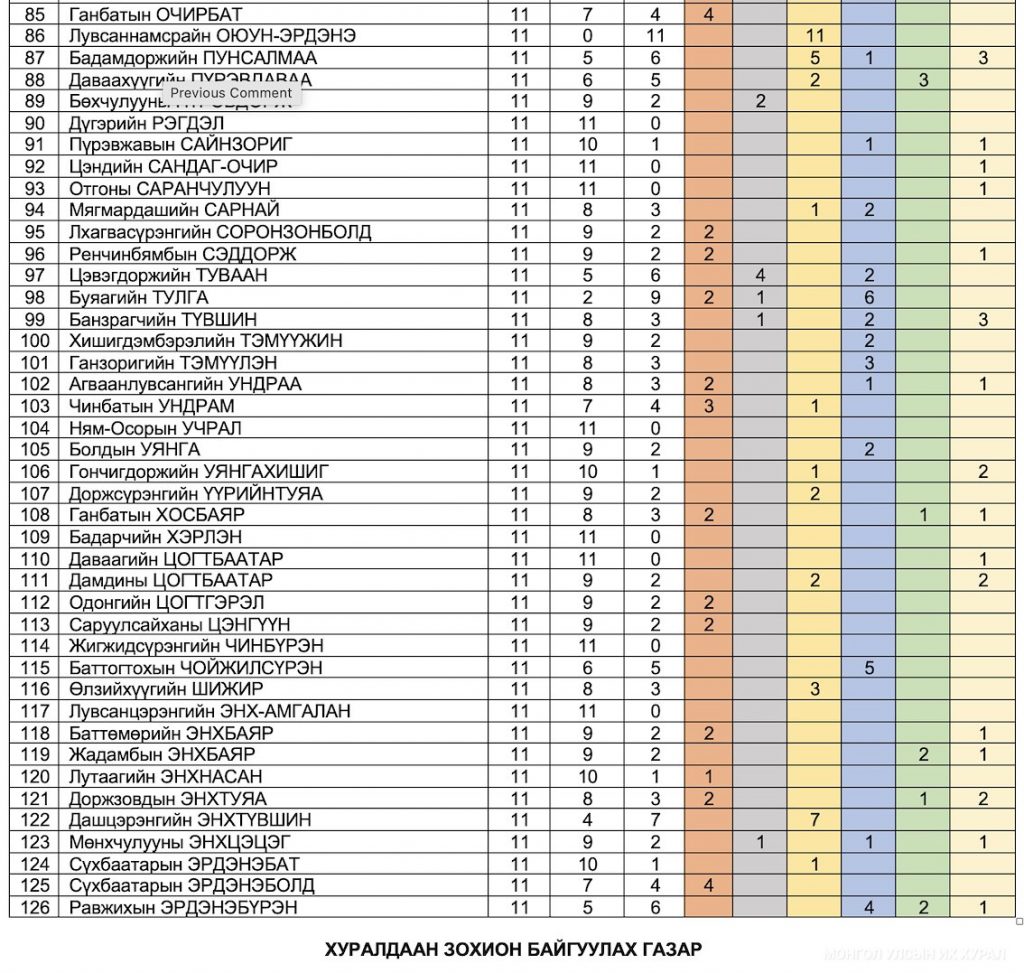 Харин Ж.Алдаржавхлан, Н.Алтанхуяг, Н.Алтаншагай, А.Ариунзаяа, Х.Баасанжаргал, Н.Батсүмбэрэл, Э.Батшугар, Г.Ганбаатар, П.Ганзориг, Ж.Золжаргал, Б.Найдалаа, Н.Наранбаатар, У.Отгонбаяр, Д.Рэгдэл, Ц.Сандаг-Очир, О.Саранчулуун, Н.Учрал, Б.Хэрлэн, Дав.Цогтбаатар, Ж.Чинбүрэн, Л.Энх-Амгалан нарын 21 гишүүн нэг ч таслалт, чөлөөгүйгээр чуулгандаа бүтэн суужээ.