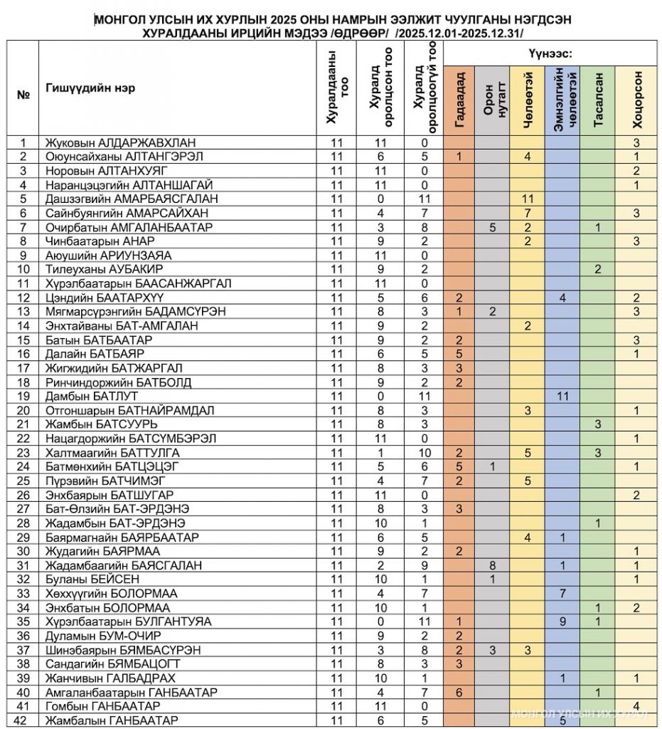 Монгол Улсын Их Хурлын 2025 оны намрын ээлжит чуулганы сүүлийн сарын ирцийн мэдээллийг танилцуулж байна. 2025 оны арванхоёрдугаар сарын 1-31-ний хооронд нийт 11 удаа чуулганы нэгдсэн хуралдаан болжээ.