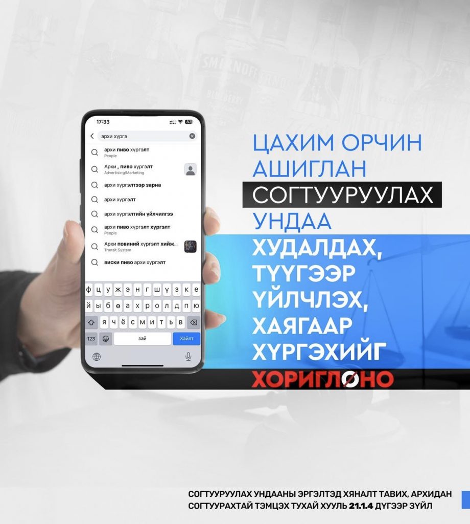 Цахим орчин ашиглан согтууруулах ундаа худалдах, түүгээр үйлчлэх, хаягаар хүргэхийг хориглоно.