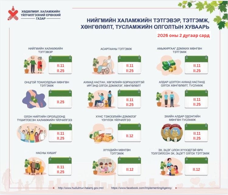 Хөдөлмөр, халамжийн үйлчилгээний ерөнхий газраас энэ сард олгох тэтгэмж, халамжийн хуваарийг танилцууллаа. Тодруулбал, нийгмийн халамжийн тэтгэвэр, асаргааны тэтгэмж, ахмад настан, хөгжлийн бэрхшээлтэй иргэнд олгох мөнгөн тэтгэмж болон “Эхийн алдар” одонгийн мөнгө, “Насны хишиг” зэргийг энэ сарын 11, 25-нд олгох аж. Харин хүүхдийн мөнгийг энэ сарын 12-нд олгох юм байна.
