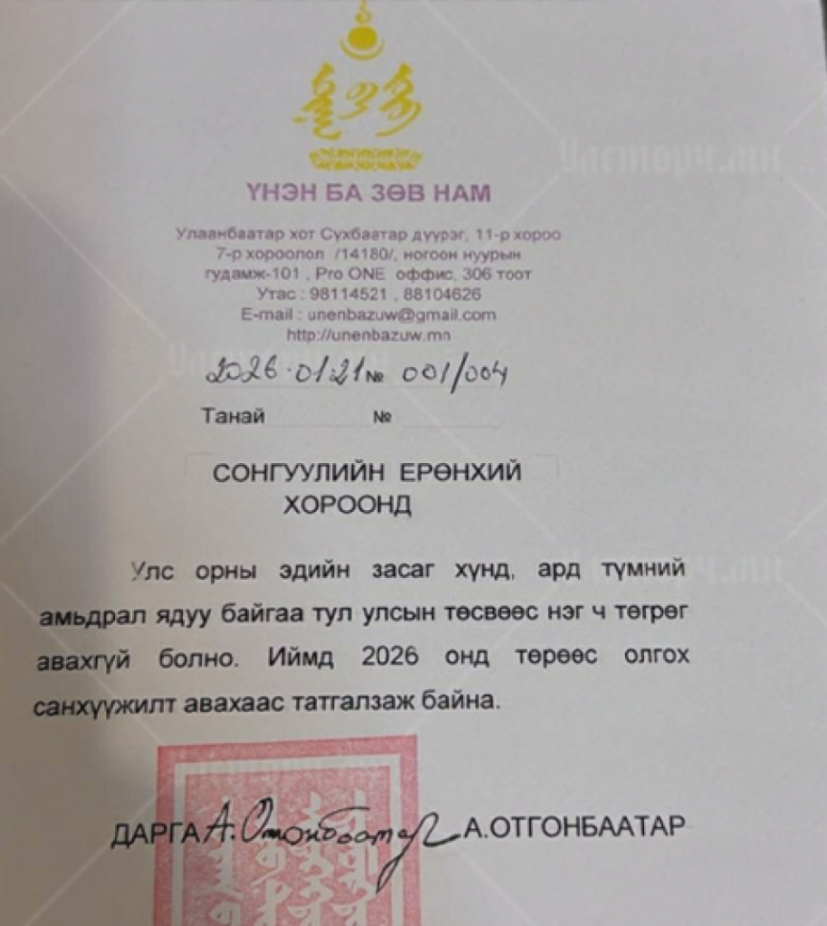 “Үнэн ба зөв” нам Ард түний амьдрал ядуу байгаа тул” гэсэн шалтгаанаар 2026 онд улсын төсвөөс авах ёстой байсан 250 сая төгрөгийн санхүүжилтээсээ татгалзжээ. Намын дарга А.Отгонбаатар өнгөрсөн сарын 21-нд Сонгуулийн ерөнхий хороонд бичгээр мэдэгдсэн байна.