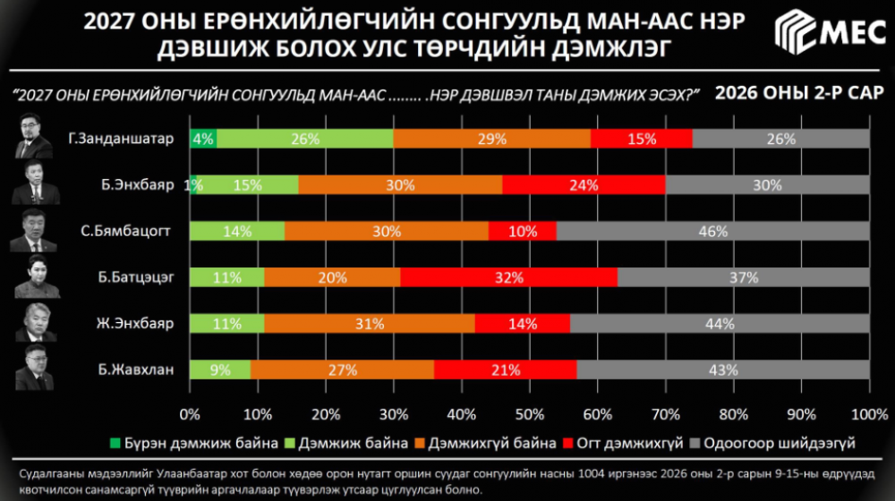 Н.Алтанхуяг Хөгжлийн банкны хэрэгтээ ороогдоод, Г.Занданшатар АН-ын шахалтад хэтэрхий олон орж бүдэрлээ гэхэд арын улстөрчид нь нэр хүнд хэтэрхий муутай, үндсэндээ 2027 оны Ерөнхийлөгчийн сонгууль 60 чавганцын уралдаан болж хувирах нь судалгаанаас тодорхой харагдлаа.
