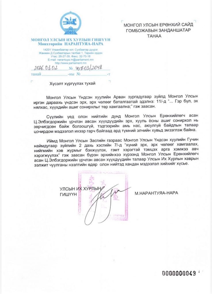 УИХ-ын гишүүн М.Нарантуяа-Нара Ерөнхийлөгч асан Ц.Элбэгдоржийн өргөж авсан хүүхдүүдтэй холбоотой асуудлаар тайлбар авахаар Ерөнхий сайдад бичиг хүргүүлжээ.