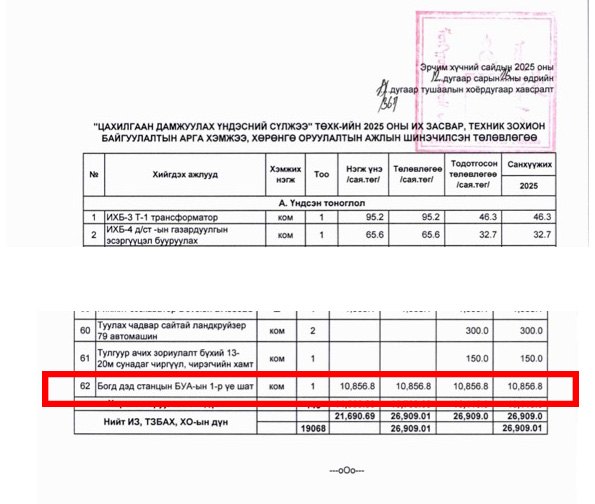 ЦДҮС ТӨХК-ний 2025 оны их засвар, хөрөнгө оруулалтын төлөвлөгөөг 2025 оны 12-р сарын 26-ны өдөр буюу оны сүүлд яаран сандран шинэчлэн баталж өөрийнхөө 100% эзэмшдэг компаний барьж буй хорооллын цахилгааны асуудлыг шийдэх дэд станцыг барих 1-р үе шатын 10,8 тэрбум төгрөгийн төсвийг суулгасан баримтыг та бүхэн харж байна. Мөн 2026 оны төлөвлөгөөнд 8,8 тэрбум төгрөгийг суулгуулсан байна.