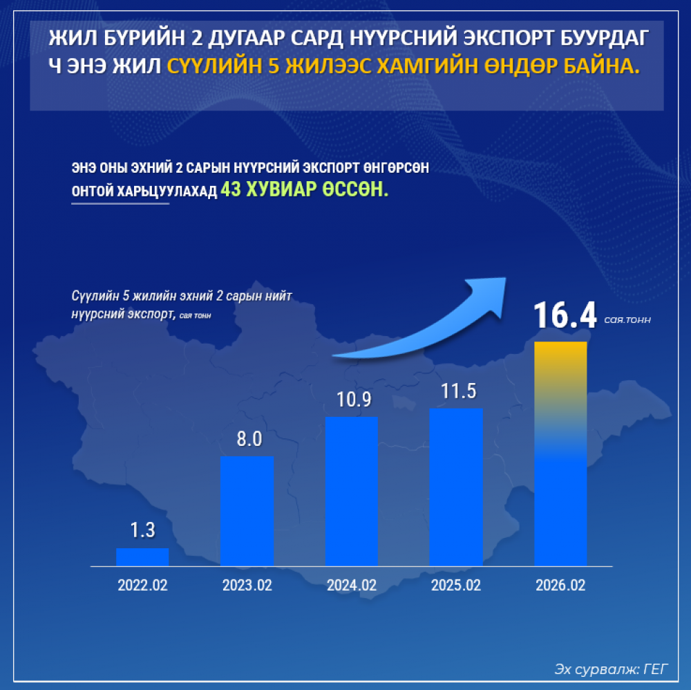 Жил бүрийн 2 дугаар сард Цагаан сарын баярын амралтын өдрүүд тохиодогтой холбоотойгоор нүүрсний экспорт тодорхой хэмжээнд буурах хандлагатай байдаг. Гэсэн хэдий ч 2026 оны эхний хоёр сарын байдлаар нүүрсний экспорт 16.4 сая тоннд хүрч, өмнөх оны мөн үеэс 43 хувиар өссөнөөр сүүлийн таван жилийн хамгийн өндөр түвшинд хүрсэн байна.