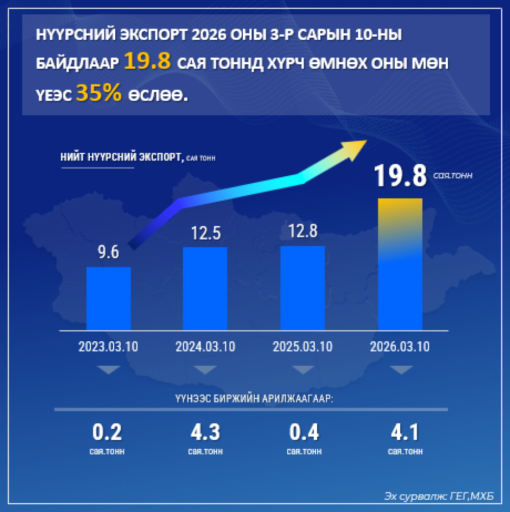 Монгол Улсын нүүрсний экспорт 2026 оны 3 дугаар сарын 10-ны өдрийн байдлаар 19.8 сая тоннд хүрч, өмнөх оны мөн үеэс 35 хувиар өсжээ.