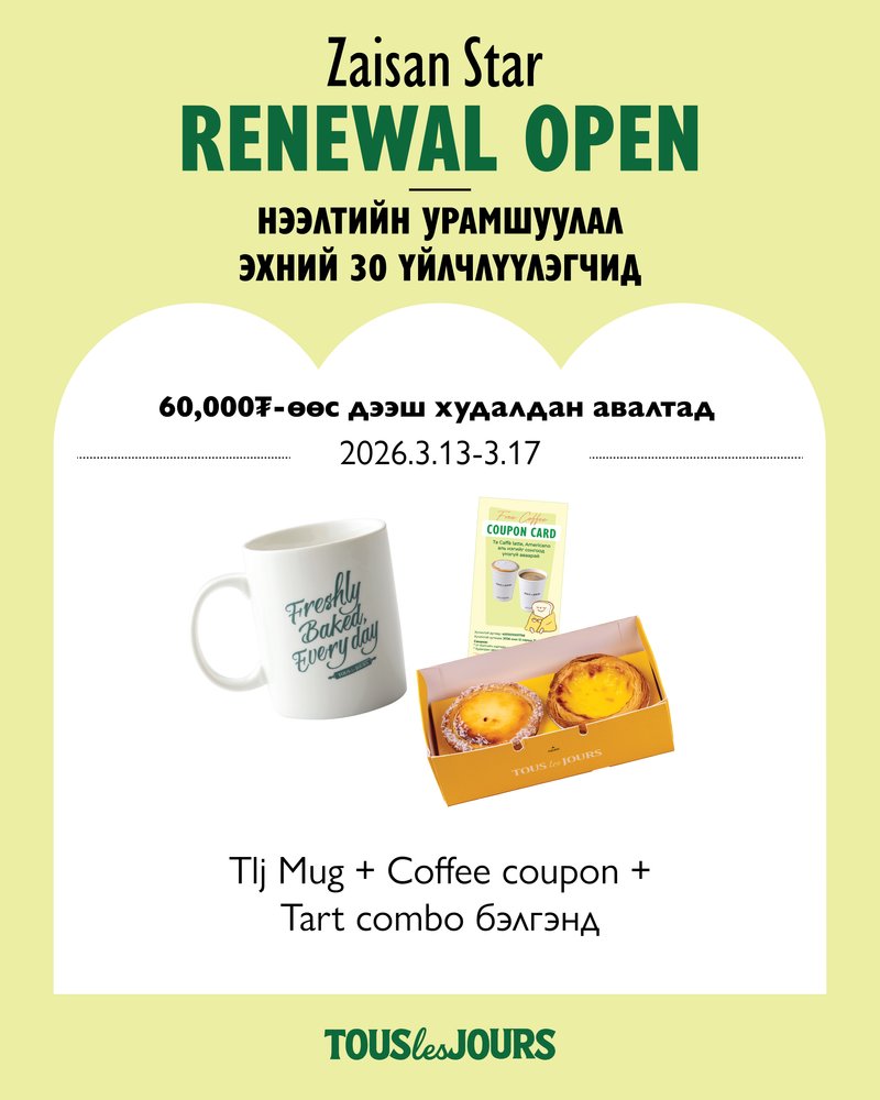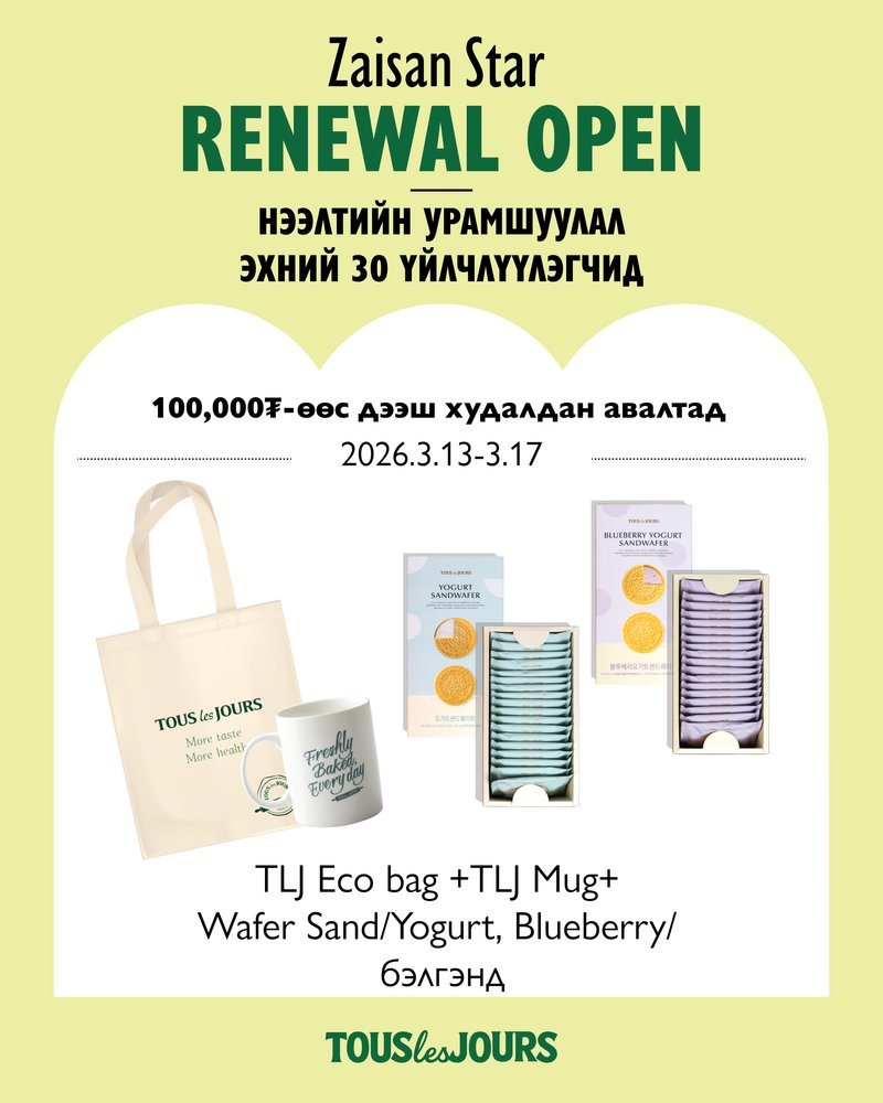 Өглөө бүр шинэхэн бялуу, анхилуун үнэртэй нарийн боов, талхаараа үйлчлүүлэгчдээ угтан авдаг Солонгосын алдарт TOUS les JOURS брэндийн Зайсан Стар төв дэх салбар бүрэн шинэчлэгдэн, орчин үеийн интерьерийн шийдэл бүхий цоо шинэ өнгө төрхтэйгөөр дахин үүд хаалгаа нээлээ.