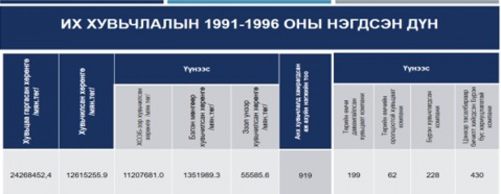 Монгол Улсын бүх иргэнд тараасан Хөрөнгө оруулалтын эрхийн бичгээр 1990-1991 оны заагт төрийн өмчид байсан нийт үндсэн хөрөнгийн 44 хувь буюу 22 тэрбум орчим төгрөгийн өмчийг хувьчлах зорилт тавьсан байна.